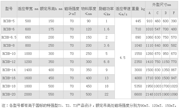 適用范圍: 適用破碎機前及輸送機膠帶上的任何物料除鐵,可適用于各種惡劣的環境條件。 技術特點: 1、磁路采用計算機模擬設計,透磁深度大,磁力強。 2、內部采用電工專用樹脂澆注,自冷式全密封結構,防塵、防雨、耐腐蝕。 3、可有效吸除混雜在非磁性物料中0.1-35公斤的鐵磁性物質。
